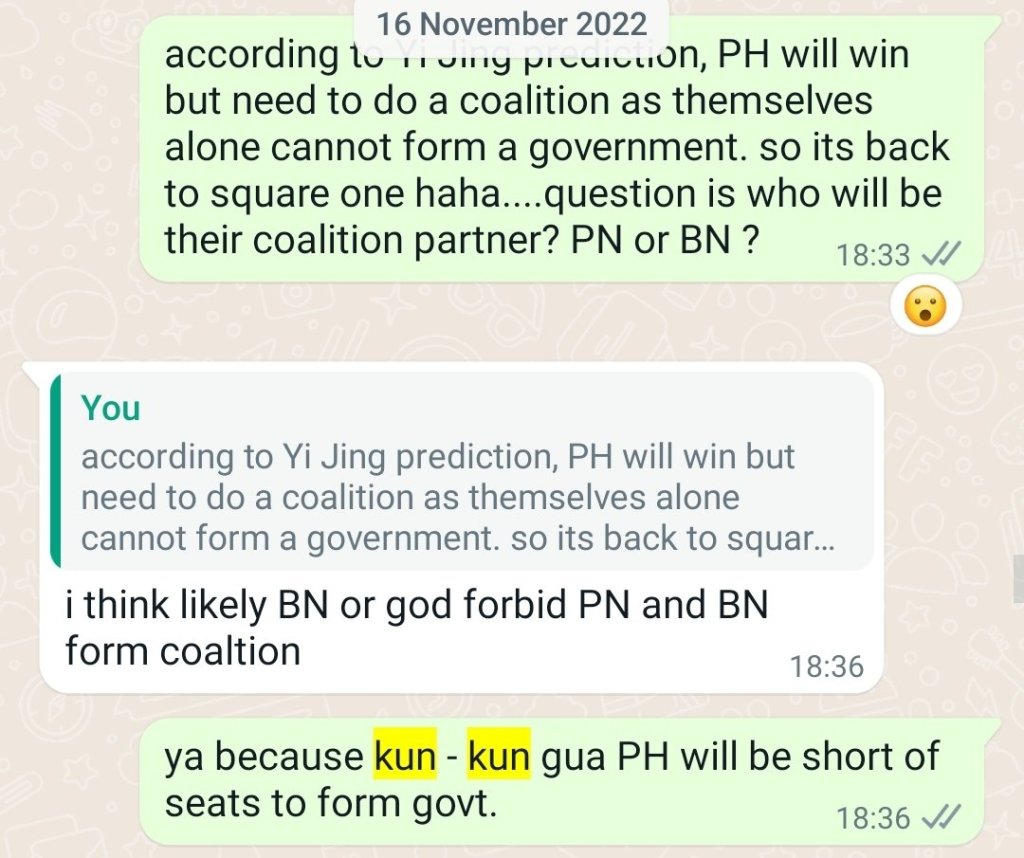 Let me cut the technicalities and go straight to the Final Gua. What we get is a Kun on Kun Gua (trigram). A Kun-Kun represents a win for Pakatan Harapan or in short PH but this win is only a small win and not able to form a stable government. Thus they will need to form a coalition. How did I get the idea of coalition? It is again from the Gua image.