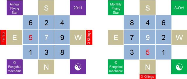 This month the Purple Star 9 flies into the center thus making the 5 Yellow settling on the North Sector. Further the 3 Killings (san sha) is also there this month. What does this makes? Houses sitting on North should avoid at all cost any renovations or move in. Either you do it before the 8th Oct or do it after 8th Nov. This will avoid inauspicious energy.