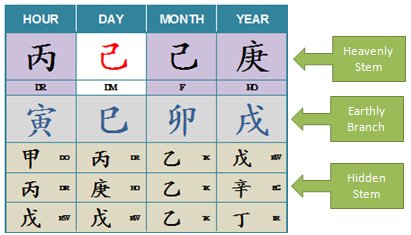 In Bazi Chart you always divide into 3 components. Heaven, Earth and Man. Here I attach a typical Bazi or Phat Chee Chart.