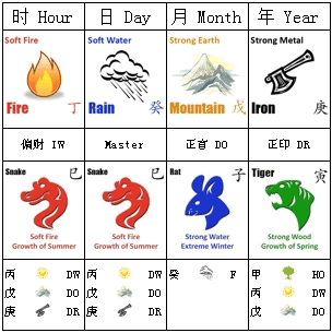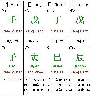 In his hour he as Ren Zi Pillar and to this chart it is called the confusion pillar. Thus all in this point to the fact that this man is a very emotional man when it comes to relationships. Ren represents in 10 Gods the Indirect Wealth while Zi is the Proper Wealth.