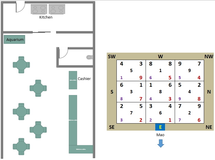 If you like flying star, here is shop layout and the flying star chart. There is no trick here, the answer is inside this layout that pull this shop apart from the other 2.