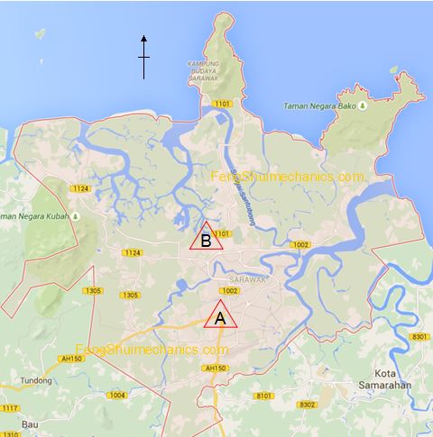 From the Feng Shui point of view, you will see that Kuching is surrounded by a network of rivers. The main river that divide the city into 2 half is the Sarawak River. The part labeled A is more prosperous and was firstly developed. The part B is more recent and quiet area mainly comprising of Government administration buildings.
