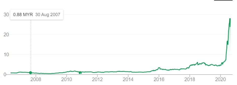 There are few good water spots to drive in wealth thus the wealth steadily improved over the years although the company was publicly listed in 2001. As you can see, Yin Feng Shui is no magic, it takes time and good human effort as well but with supportive energy it, rises steadily from 0.88 cents to about 3.oo over 10 years. Just before the Pandemic, it was already closing on to 4.00. Then into mid of 2020 it suddenly when on a surge. This surge is to some extent due to global pandemic issues.