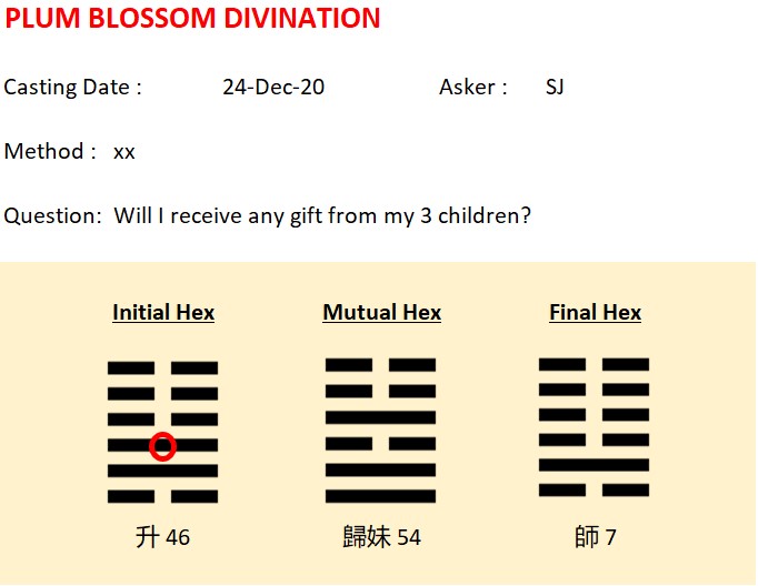 Plum blossom is an easy art to cast and to help us by giving us a clue onto the situation we have concerns and seek guidance. In this case, it was done for learning purposes by the student.