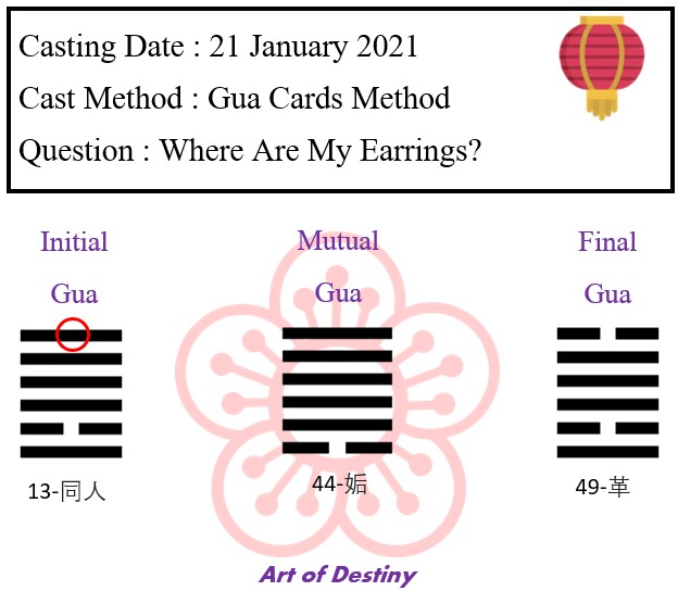 From the initial gua, the good news I got from the Tong Ren Gua (13) is I should find back my earrings. This is foremost a relief for me. Then I proceed to read the Mutual Gua and the gua tells me that it will take a while or it will take some considerable effort to locate it. Perhaps try to locate in the North West direction of the house, this is what seems the gua is hinting me.