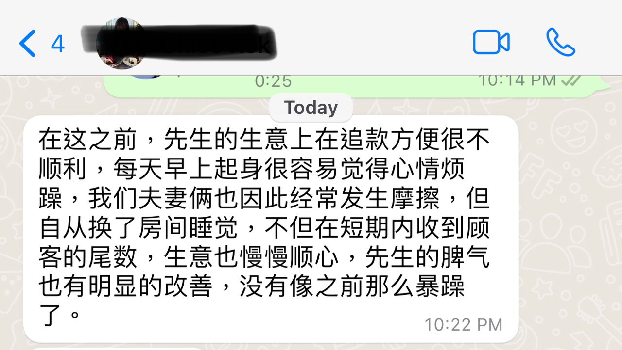 The problem was the husband business face collection problem. Everyday morning wake up also felt frustrated upset. Husband wife relationship argue frequently also because of this. after husband changed room and bed position, he managed to collect back some money and the business slowly got smoother. His temper also seen improvements.