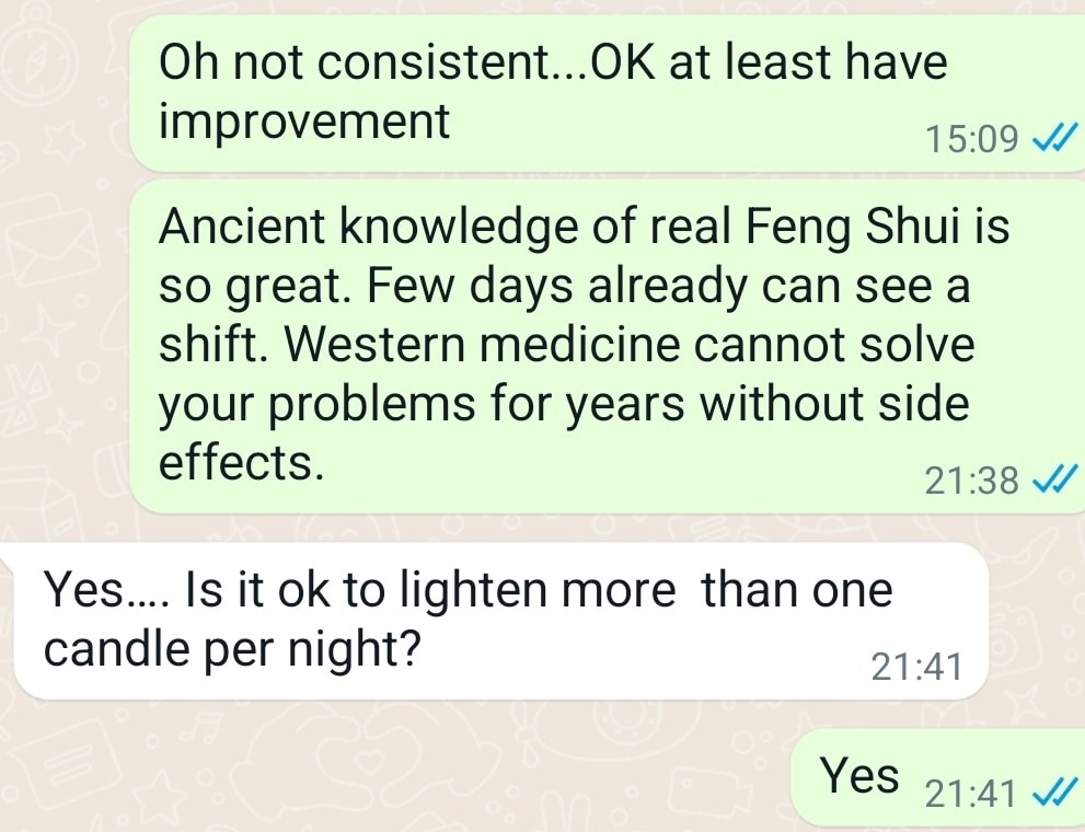 When I was at a loss, I went to Alan, and he told me to light this feng shui lamp, which can help me absorb good energy. I started it a week before surgery. At the beginning, it was 5-6 hours a day, which was very strange. On the second night, I slept until dawn, and my whole body relaxed a lot. I was fine the day before the surgery. I still order it every day, full of positive energy! – Ms Teh, Subang Jaya