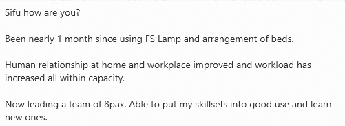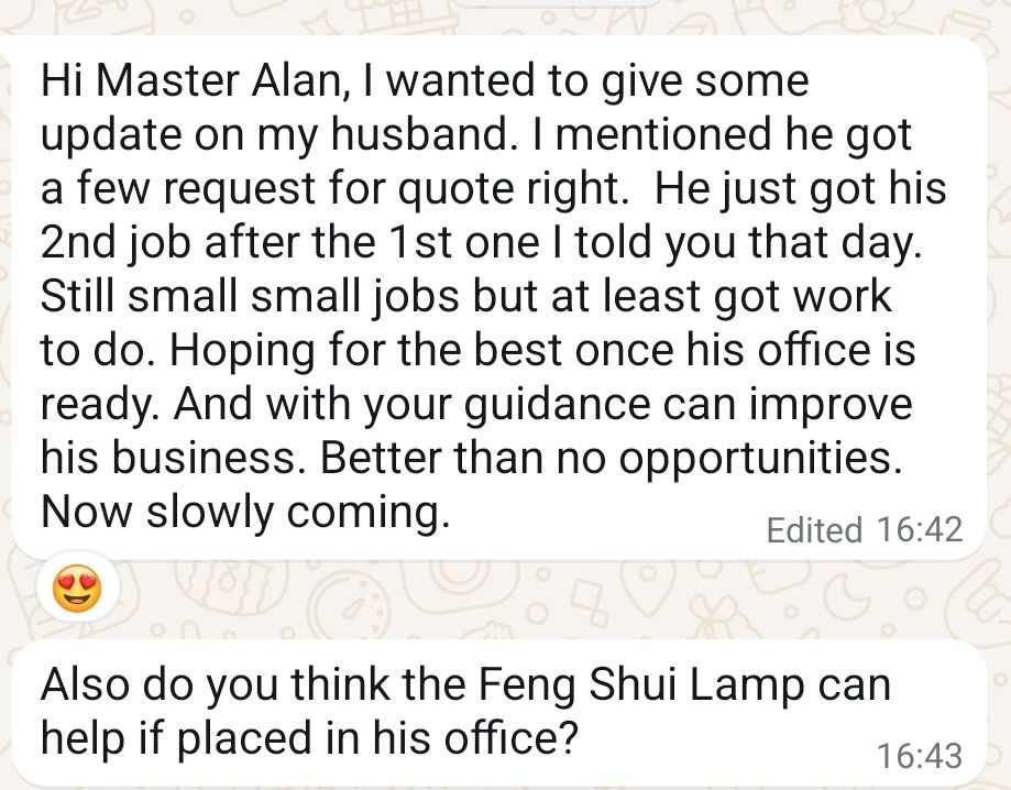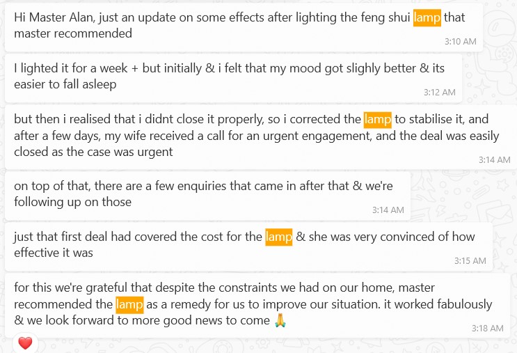 I knew Master Alan been practicing Feng Shui since decade. I trusted him from his engineer’s mind into metaphysic and I was introduce to this Feng Shui Energy Lamp from my god brother.