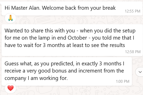 想与您分享这一点 – 当您在 10 月底为我对灯进行设置时 – 您告诉我我必须至少等待 3 个月才能看到结果. 你猜怎么着,正如你预测的那样,在整整 3 个月内,我从我工作的公司收到了非常好的奖金和加薪。