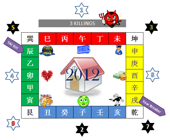 Here is the 2012 Feng Shui View, the annual afflictions and the good stars .